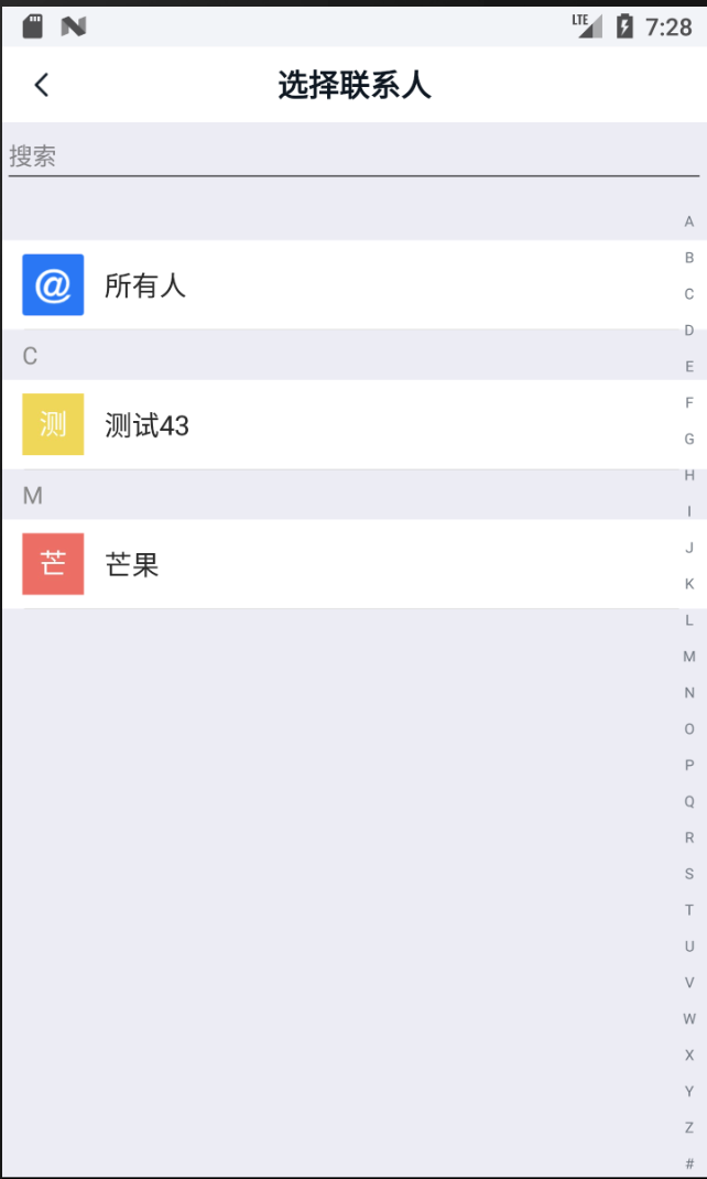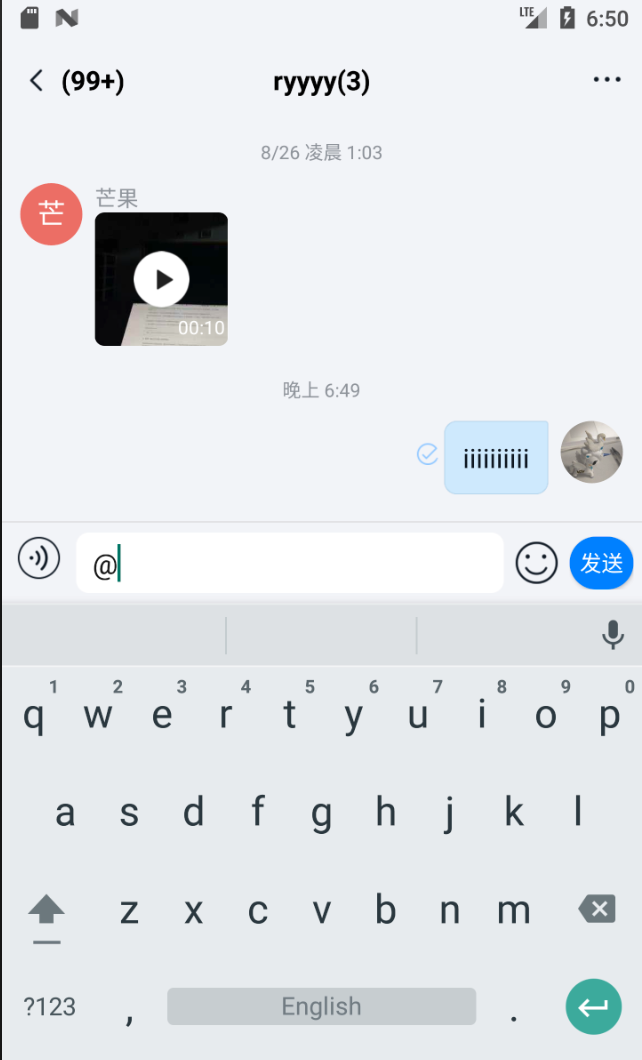 When @ functionality is enabled, typing the @ character triggers the member selection page (MentionMemberSelectActivity
