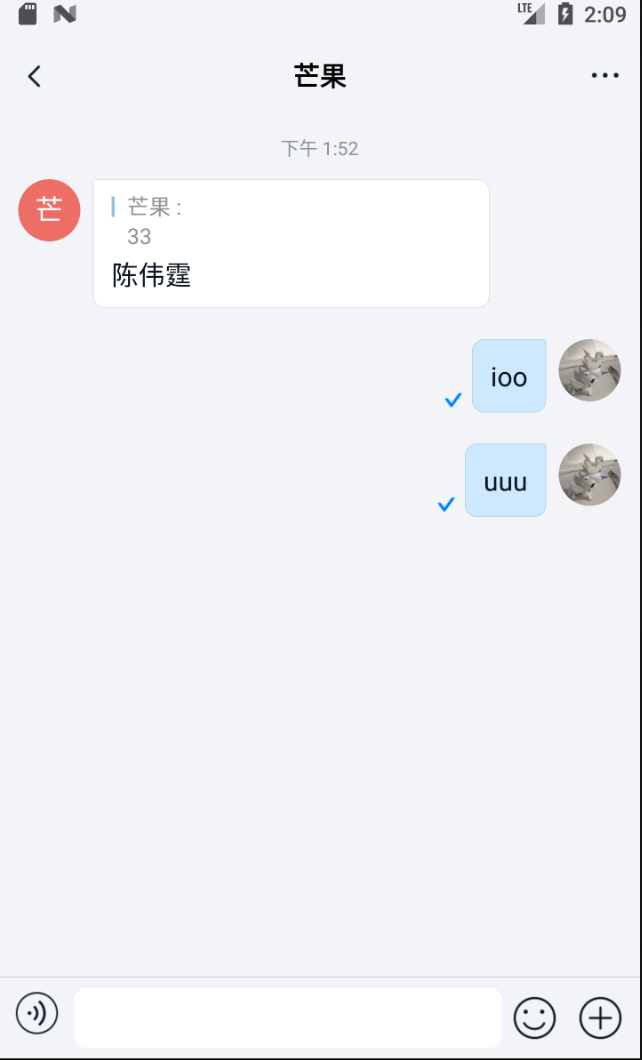 - Chat UI: A checkmark appears at the bottom-left of sent messages when read.