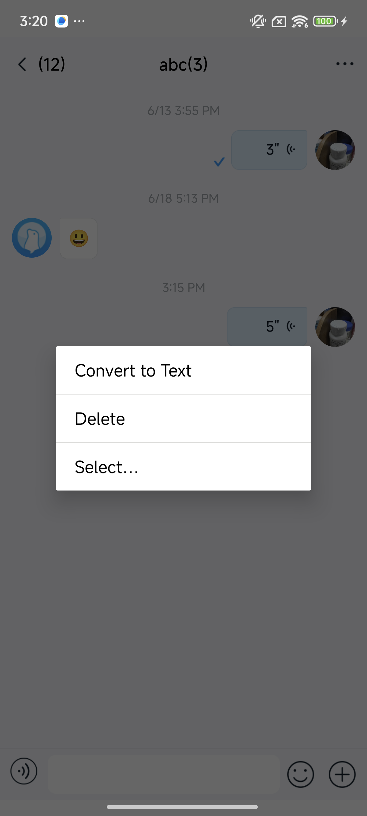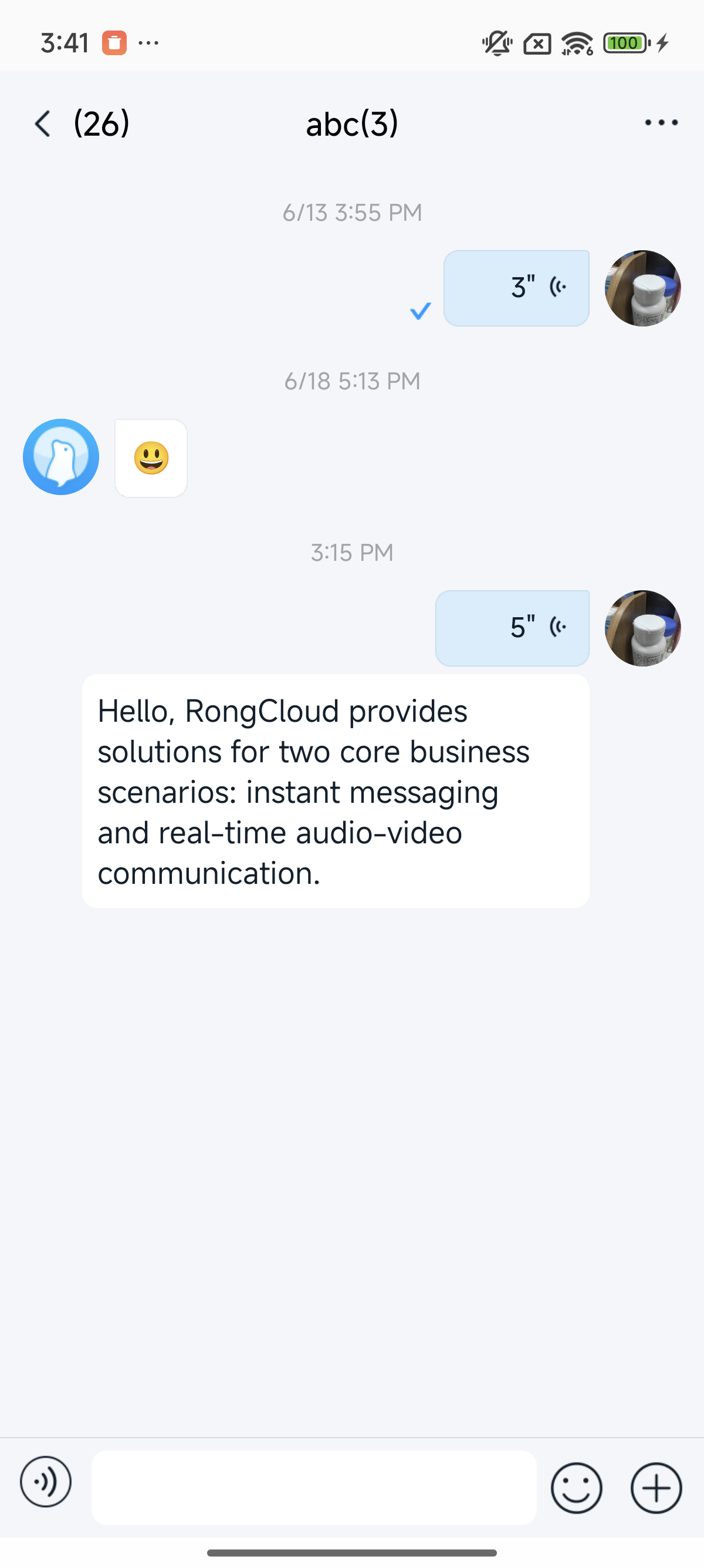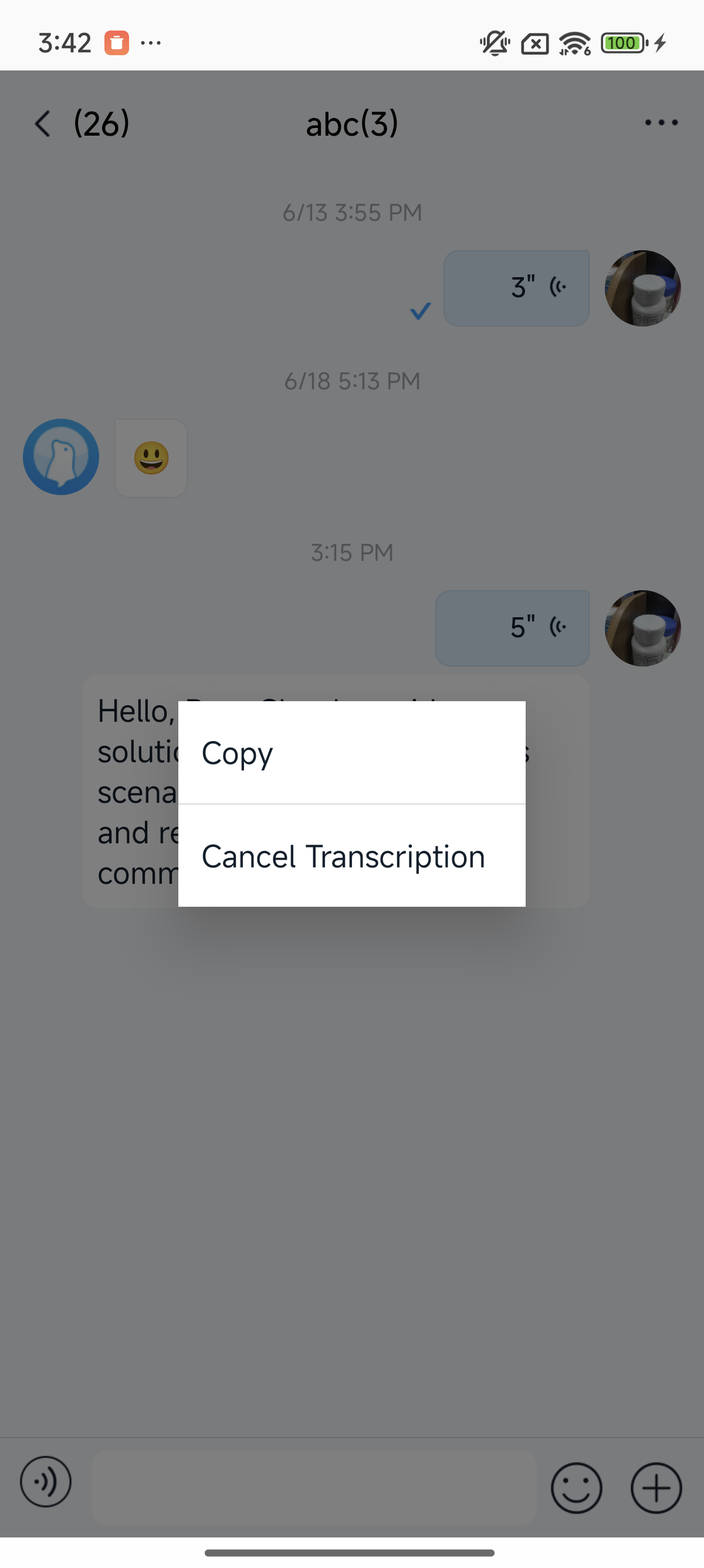 The IMKit SDK supports recording voice messages up to 60 seconds. In the chat UI, users can long-press a voice message bubble, select Convert to Text from the menu, and use the IMLib SDK to transcribe the audio into text. The SDK tracks the visibility state of converted text, ensuring UI consistency when re-entering the conversation.