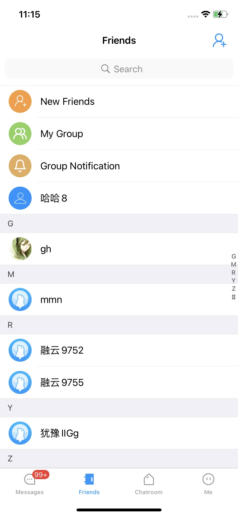 The Contacts page displays all friends of the current user on the device. Upon entering this page, the IMKit SDK retrieves friend information from the database and sorts it alphabetically by friend name (displaying the alias if available).