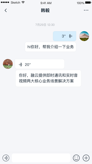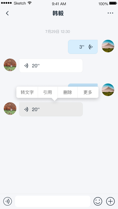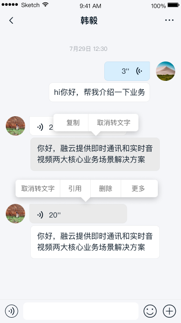 The IMKit SDK supports recording voice messages up to 60 seconds. In the chat UI, users can long-press a voice message bubble, select Convert to Text from the menu to invoke IMLib SDK's speech-to-text conversion. The SDK tracks visibility states of converted text, displaying text UI based on visibility settings when re-entering the conversation.
